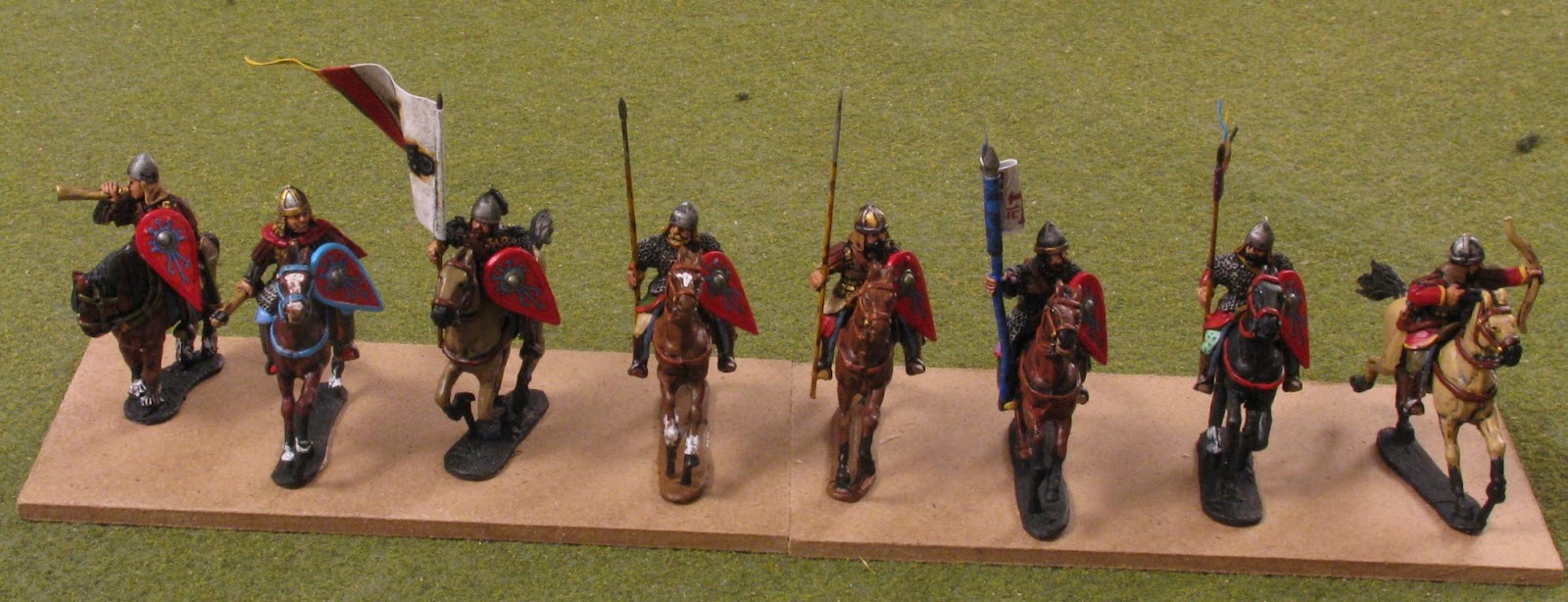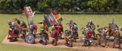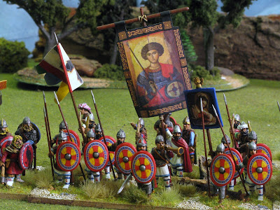The main line infantry of the Byzantines were the Skoutatoi, close order heavy foot (FP in Impetus) armed with long spear, and backed up by a stand of supporting archers. These are a deep unit in Impetus for the Nikephorian and Konstantinian armies, or are separate units in in Comnenan armies.