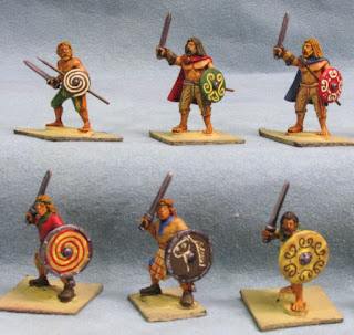 I've worked on the Irish for seven months or so, and this is the first painting I've done in many years. So there is a real difference between the first figures and the last. My earlier figures appear muddier (I was using one wash at the time -- I changed to a color specific wash per item over time). Also, I believe my detailing improved over time, certainly I accomplished more with the shields as I put in more time painting. I will use the changes over time to visually show class. There are three classes of soldier for the Irish in the Impetus Dark Irish list -- kern, bonnacht, and nobiles. I will make the kerns the least colorful and muddiest looking units, the nobiles will be the most colorful and cleanly detailed figures, and the bonnachts will be in the middle.